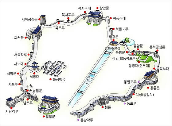 수원화성은 조선왕조 제22대 정조대왕이 세자에 책봉되었으나 당쟁에 휘말려 왕위에 오르지 못하고 뒤주 속에서 생을 마감한 아버지 사도세자의 능침을 양주 배봉산에서 조선 최대의 명당인 수원 화산으로 천봉하고 화산 부근에 있던 읍치를 수원 팔달산 아래 지금의 위치로 옮기면서 축성되었다. 수원 화성 은행 궁이지만, 생각보다 그 크기가 커서 돌아보려면 한나절이 꼬박 걸린다고 한다.