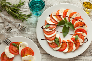 카프레제는 이탈리아 남부 나폴리에 있는 카프리섬에서 탄생한 음식이며 빨간색의 토마토, 하얀색의 모차렐라 치즈, 초록색의 바질이 들어가기 때문에 이 색들이 이탈리아 국기 색과 비슷하답니다. 토마토의 상큼한 맛과 치즈의 고급스러운 맛, 바질의 향긋한 맛으로 본격적으로 파티 시작하기 전 입맛을 돋우는 카프레제는 어떨까요? 만들기 쉬운 데다가 누구나 좋아하기 때문에 파티의 단골 메뉴라고 할 수 있어요.